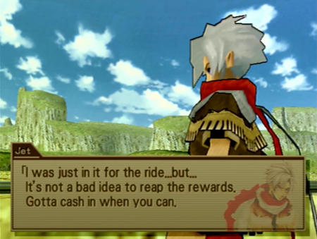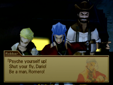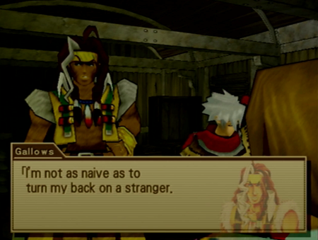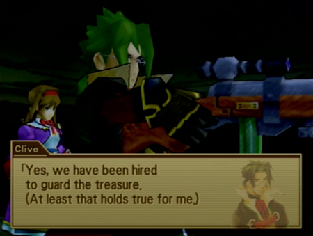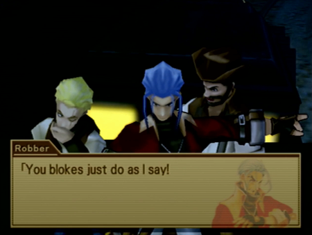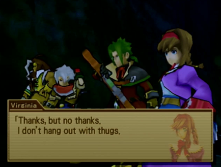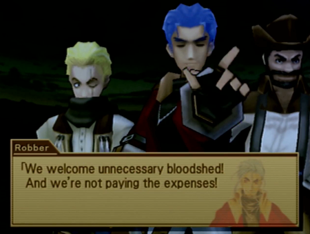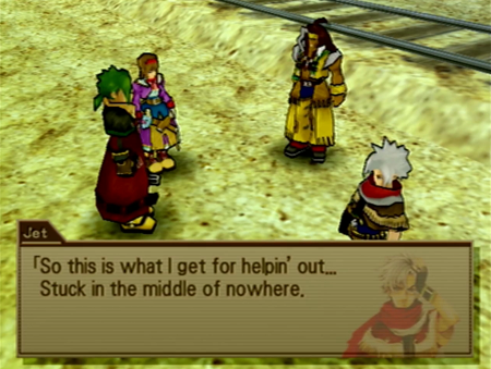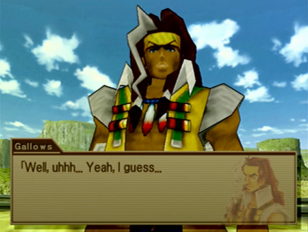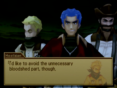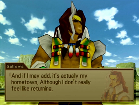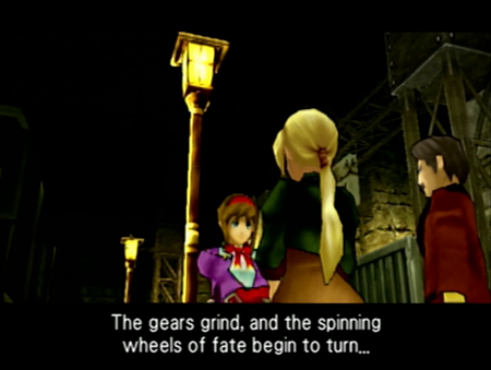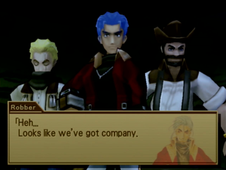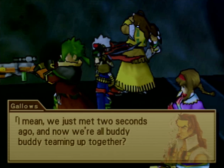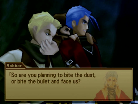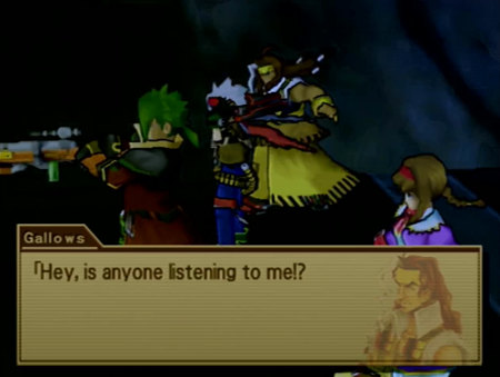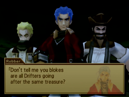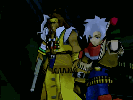Quick aside: Wild Arms 3 seems to present Drifter teams in groups of four. The backstory to these guys is that they used to have a fourth member, Lucio, but he died under mysterious circumstances. “Mysterious”, in this case, is defined as “nobody ever decided to spring for a flashback/model of Lucio”. Whether it was to save a couple of bucks or because nothing could be more interesting than the myths about the legend of Lucio, Lucio does not actually appear in Wild Arms 3 at all. That said…