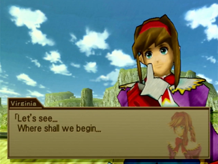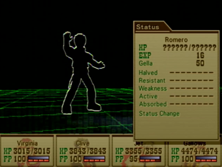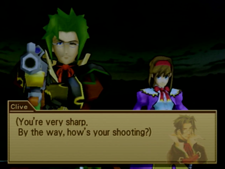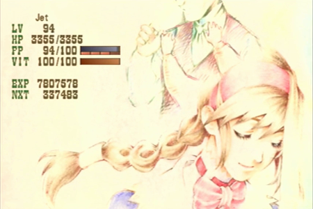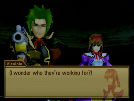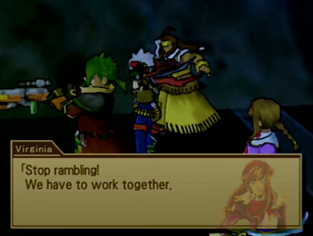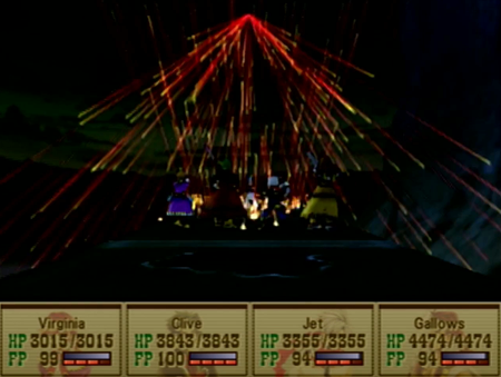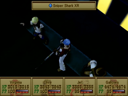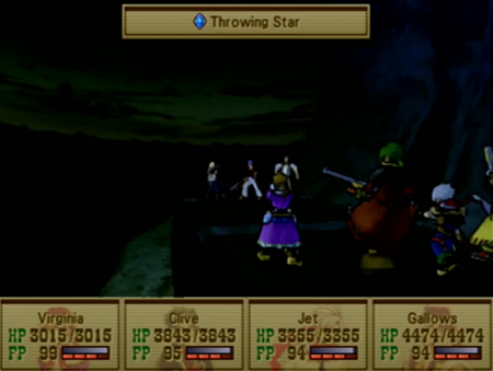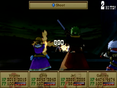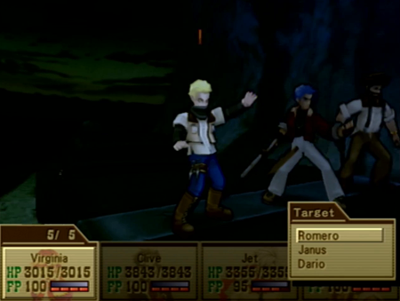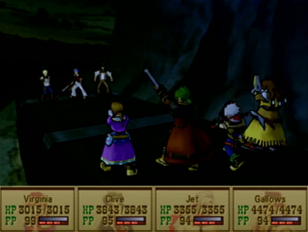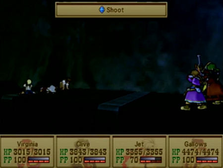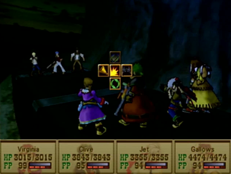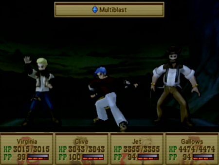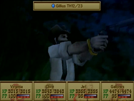 Wild Arms 3 is turn based, so everybody (opponents included) just chooses an action at the start of the round, and then waits their turn to gun down opponents. Jet and Virginia usually act at the top of the turn, while Gallows and Clive usually wind up toward the end.