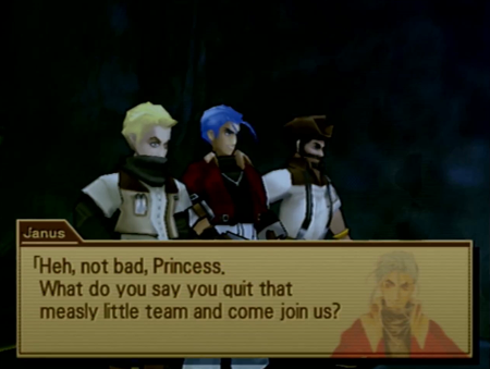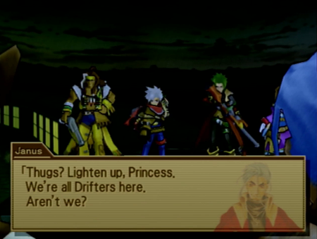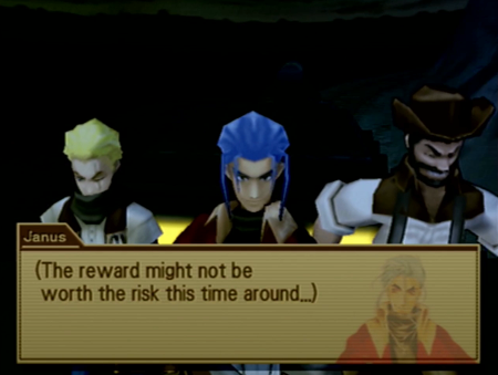 Given his blue hair, red motif, the fact that his ARM is a bayonet style gun, and another parallel that comes along in a few hours, I always assumed Janus was designed as a sort of “evil twin” counterpart to Ashley Winchester, main protagonist of Wild Arms 2. They do not have much in common on the personality front, but I’ve always thought there was a resemblance. Janus is certainly a lot less… friendly.