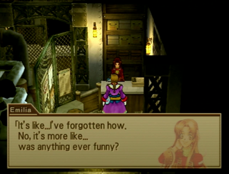 Some of the comments are more significant than others. Emilia learned how to smile again after we slayed the sea serpent that killed her beloved Mario, but now she literally cannot remember why smiling is a thing.