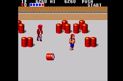 Jaunty Little WalkDouble Dragon (for SMS) is kind of a turd. It’s 2-Players (right there on the box!), which is a step up from its NES brother, but a polished turd is still a turd. It’s a Beat ‘em Up, which is a genre that flourished in the 90s mainly due to wonderful licenses (Teenage Mutant Ninja Turtles and The Simpsons spring immediately to mind), but in the early days of the genre, it was two guys fighting the same four guys over and over and over again. Here’s generic guy, Wannabe Nightwolf, generic girl, and Abobo. All of the characters have the same abilities: shuffling, punching, and jump kick susceptibility. Billy and Jimmy, our heroes, have the same skills, except they substitute their jump kick susceptibility for jump kick distribution, which allows the Double Dragon(s)(?) to fight through the streets with the greatest of ease. How many streets? I have no idea.