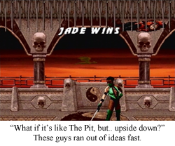Speaking of Looney Tunes, this is about where the insane mythology creep started, as Mortal Kombat was no longer a martial arts tournament hosted by an ancient master, oh no, this was all a plot by the ruler of another dimension that got all of its fashion tips from Mad Max. And that green ninja hiding in the first game? He’s a member of an ancient lizard race and secretly fighting for oh man I cannot finish this sentence.