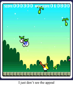 Make no mistake, the entirety of WarioWare is a trick. WW was released in 2003, a full five years before the launch of the Apple App Store. Relevance? Much of WarioWare is based on bite sized games that last ten seconds, max. These short, “burst” games are all the rage now, in the age of cellphones and ipads and other devices those damn kids keep playing on my lawn. 2003 was still the age of “game lasts 800 hours and is considered college credit in six states”, when the idea of games that lasted three minutes because that’s how long you’ll be in the supermarket checkout line was a long way away. And the controls of WarioWare? One button, four directions, done. Want me to name another device with one button? It’s small and rectangular and rhymes with iTyrone. Nintendo… I mean Wario… invented a genre at least half a decade before its official debut. And how does one sell such a series of games before the advent of effortless downloads and teeny pricetags? Blend them all together, call it a combined “challenge”, and slap your most devious mascot on the cover. After all, we know we have a brand new, completely unproven (but fun!) game here, if it fails, we can just laugh it off as another Wario blunder. Oh, that wacky, smelly guy.