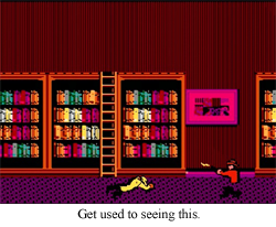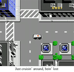 Reminder: Dick Tracy can receive ten hits, total, for an entire chapter. You can recover health by finding a first aid kit (good luck), and then entering the intuitive command B+Select. If you figured this out on your own, good job, Stephen Bloody Hawking. As an extra special “screw you” from the designers, if you are down to your last hit point, you can swing by any police department, and they will restore you to… two hit points. I wouldn’t worry about it, though, as you’ll just die on the car ride over anyway.