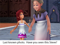 Is anyone at all worried about this woman?Kairi had a grandmother, we’ll call her Steve, back when she was a lil’ child in Radiant Garden. Kairi was shipped off from that planet when she was a young’un and Labcoat Xehanort was wrecking up the place. Steve’s fate is unknown.