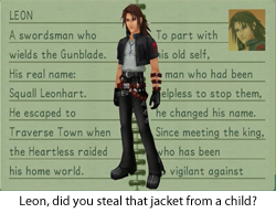 “Leon” is Final Fantasy 8 Squall + Buffy the Vampire Slayer’s Angel – Selphie (as she’s on an entirely different planet). Those of you that are good at math may recognize this as the equation for OMEGA ANGST. As such, I have always assumed that Leon’s tragic past involves being suspected of shoplifting at Hot Topic, and, unable to live with the ACCUSATIONS, SHAME, and DESTRUCTION OF HIS FREQUENT SHOPPER CARD, Squall was forced to change his name.