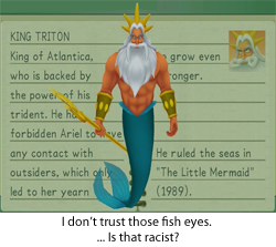 And Triton is a wise-old king archetype, so it’s also possible King Mickey, keyblade master, stopped by at some point to confer on kingly matters. It’s basically how the mouse hooked up with another wise, old king, Ansem the Terminally Stupid.