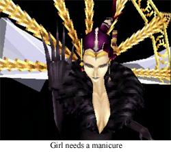 Alright, enough with the krapYou can’t look at a story without analyzing its villain, so kan we start Ultimecia time? It has been said that Ultimecia is one of the thinnest characters in Final Fantasy lore, completely devoid of motivation beyond being eeeeeevil. I posit that that is only half right. Ultimecia is a completely shallow character, but that’s because she’s supposed to be; infact, she’s not even supposed to be a character at all, she is a primal force, like a hurricane or Black Friday: Ultimecia is loneliness. In a game that is all about people and their connections to other people, Ultimecia is the ultimate loneliness, the void that is not having anyone. You will note that Ultimecia’s only real, willing ally is Seifer, a character that is A. crazy, B. self-destructive, and C. quits the minute he accepts friendship. Beyond that, Ultimecia is alone: she does not have generals or companions in her castle, she just has hordes of monsters of varying size and rank. Her castle, one of the largest single structures in the game, is devoid of any soul other than Ultimecia. And her goal? She seeks ultimate power, yes, but not to the traditional end of ruling the world or becoming a true, omnipotent god, no, she wants to create Time Kompression, a vaguely defined concept that culminates with her being the only thing in existence, not ruling like a deity, but wallowing in her own eternal loneliness. Everything Ultimecia does is to facilitate this crazy goal. Obviously, it’s ridiculous, but Ultimecia is meant to be a ridiculous, living metaphor of a character. Final Fantasy 8, at its core, is a modern fairy tale, Squall is prince charming, Rinoa the princess to be rescued, and Ultimecia the evil queen that is less a person and more a pure, malevolent concept. Maleficent and Ultimecia basically went to the same finishing school.
