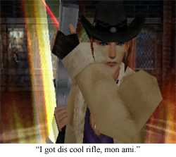 Gonna blast some dudesIrvine Kinneas is first on the hit list. If FF8 is trying to deconstruct tropes anywhere, it’s with Irvine, who is a seventeen year old boy, and is somehow in the running for greatest sniper on the planet. Come to think of it, he might be the only sniper on the planet. Regardless, Irvine’s main character trait is how he watched way too much X-Men The Animated Series as a kid, and seems to believe he’s the reincarnation of That Scumbag Gambit. Or, at least, that’s the veneer he projects: in truth, he’s a little shell shocked by apparently being a phenomenal murderer well before he’s old enough to know not to wear a cowboy hat with that many ear accessories, and uses the “badass” personality to repeatedly fail with the ladies. Irvine’s most important moment in the game is during the infamous ending of disc 1, when Super Sniper fumbles the one task he was specifically hired to perform, and can’t bring himself to shoot his adopted mother in the face. Way to not man-up, bro. To completely over psychoanalyze the polygonal fellow, we’re looking at a guy who drastically overcompensates for his own perceived masculine failings (that he’s not an unstoppable terminator) via an overinflated and garish libido. While he never grows completely out of this behavior (his final scene involves hitting on Quistis… not that I can blame him), it’s clear throughout the game that his friends and Selphie specifically grow to accept the “real” Irvine, and he seems to gradually forsake the pickup artist nonsense over time. Either that or the writers forgot he existed after the second disc. Lord knows I did.