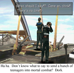 Final Fantasy, the franchise, went to this well in the finale of four games prior to Final Fantasy 8 (five if you include Ben and his buddies in Final Fantasy Gaijin), and while it always made a special point about how all the members of your party are super best buddies and Cecil and Kain have a special bro bond that can never be broken, or Setzer has some fabulous fashion advice for Gau, the games always fell short of portraying convincing friendships between these characters. Keep in mind that these are people that will and sometimes literally do die for each other. Hell, General Leo went to the grave thinking Sabin René Figaro had the same name as a TV show from the 70s.