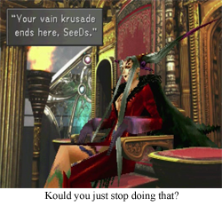 So, yes, friendship saves the world in Final Fantasy 8. Loneliness is defeated by affection and companionship, and these themes are reinforced every time you rearrange your magic loadout. There’s also a million little nods to the theme throughout the game that I haven’t even begun to mention (Balamb Garden gains the ability to friggen fly only after all of its residents learn to live in harmony, the Ragnarok is infested with “pairs” of monsters that must be eliminated accordingly, Adel rules alone and is almost pure evil, and her later solitary confinement causes problems for the whole world as she tries desperately to reach someone, anybody with her cries for help, etc), but I think I’m running low on words at this point. To be precise, Final Fantasy 8 is the most fully realized video game about teenagers exploring the social links between themselves and others, and using the assistance of mythological creatures to defeat a malevolent allegorical force. It’s a shame the Final Fantasy franchise has never been that focused since, as these themes and ideas really seem like fertile ground for perhaps an entire franchise all its own. Whatever.