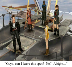 Where's Xu?I’m going to mention Xu here because nobody ever remembers Xu. Admit it, right now you’re trying to figure out if I’m making up a character, or talking about some enormous, deadly bird. She was in the ending, people! Anyway, she’s not really all that important, but I just wanted to note somewhere that SeeD has plenty of people not in the immediate party but still actively supporting the cause, which is a rarity for the franchise, where, say, Cecil originally commands an unrivaled air force, but ends up having to tackle an entire celestial body during the finale with only four companions. Most games don’t have a Xu and crew, and I speak from experience when I say it’s not easy to successfully crash a flying college into another, also flying college. Without a Xu in your corner, it’s damn near impossible.