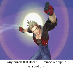 Just talk about hot dogs!Seifer has a toxic relationship with Squall Leonhart, the most misunderstood character in gaming since the previous Final Fantasy protagonist. While I love to mock the guy, he’s not emo (even though you totally know he writes poetry about how sad he is all the time), he’s not goth (even though he dresses in mostly black with custom made jewelry you can totally buy at Hot Topic), he’s not even all that complicated; he’s just a teenager. He has problems expressing himself, he wants to do good, but has a hard time identifying the “right” path, and has general issues with leading others. It’s an odd trick, but if the player accepts Squall’s faults as opposed to immediately chastising them, one may find that Squall is much more the fabled “everyman” than the average wholly silent, tabula rasa JRPG protagonist. He just has the unfortunate handicap of being an actual teenager.