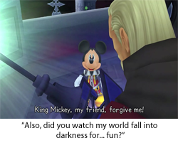 Kingdom Hearts 2 is really where Mickey comes into his own. First of all, Mickey is working closely with Riku (currently looks like Ansem, Seeker of Darkness) and bandage freak DiZ (Dude, it’s Ziggy!). These three know the plot, and while Riku and Dizzle Dawg have their own reasons for keeping Team Sora in the dark, Mickey has no such hang-up, and will explain everything just as soon as he feels like it, which is at approximately the half way point of the entire game. Prior to that he was… doing his laundry? He’s only recently gotten into wearing shirts, and his whites are very important to him. Mickey basically does weird, shadowy-but-ultimately-good things in the background of the first half of the game, then explains the plot, helps out for like an hour, and then ducks out until the big finale. Also, during this time, because he’s keeping that promise to Riku, Mickey refuses to tell Sora anything about Riku’s whereabouts. While it’s never outright stated, given Sora’s reaction to Riku upon their reunion, and his general concern prior to that, Sora pretty much assumes Riku is dead. Sora assumes Mickey is holding back some brutal truth to spare his feelings, so Sora wanders from planet to planet, probably crying into his gummi chair, mourning his imagined-dead friend. Dammit, Mickey.