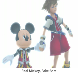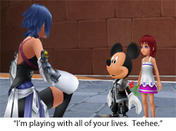 After that undefined something, Mickey becomes Riku’s cheerleader for Chain of Memories. Riku is grappling with his new dark powers, and begs Mickey to kill him should he fall back into the darkness. Mickey, who practically just met Riku, claims he cannot make that promise, because Mickey values Riku’s life far too much. Days earlier, Sora, Riku’s best friend, beat Riku to death like three consecutive times. Riku and Mickey march out of Chain of Memories, and even make a new friend who wears bandages all over his face and isn’t suspicious at all.