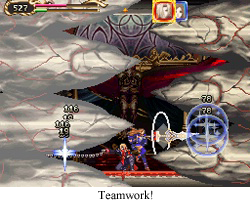 But Portrait of Ruin has a whole lot of heart (and not just hidden in candelabras). Jonathan Morris, our Belmont du jour (mostly), and precocious witch Charlotte Aulin are the dual heroes of the piece, and their interactions and general personality uplift a potentially dour quest through a castle of undeath. Eric Lecarde of Castlevania Bloodlines returns as a dead man who gets far more character development than he ever did while breathing. Stella and Loretta are delightfully malicious vampires for the majority of the piece, and pleasantly remind me most of Buffy the Vampire Slayer style “quippy sadist” vamps. Victor Brauner isn’t much of a villain by comparison, but he does get bonus points for being based on a real guy. It’s a cast of, basically, six people, but it’s amazing how such a small ensemble can be memorable and meaningful. Jonathan and Charlotte both grow over the course of their adventure, not only through acquiring skills and vanquishing chimeras, but also through acquiring understanding and vanquishing daddy issues. Once again, it ain’t Hemmingway, but it does enhance what could easily be a rote affair.