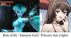 Ruto, Princess of the Zora, is a similar character type, but marginally different from the more overt tsundere. Ruto is more of a “straight” princess archetype (remember that she’s one of three different princesses in this adventure). She is haughty, arrogant, and expects everyone to immediately bow to her will. She’s different from the tsundere type in that she has no problem admitting that she likes the leading man, but she still expects the downtrodden dude to read her mind and do her bidding without provocation. She’ll fight on the battlefield, all right, but she expects to be carried to the skirmish. Not coincidentally, Ruto is the one princess of the piece that markedly needs to be rescued, which provides a handy narrative explanation for why such esteemed royalty would stoop to aid riffraff like these commoners (still mostly princesses).