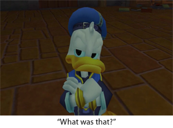 Right from the beginning, Donald and Goofy are walking a tightrope (note: would like to see this), as their mere presence in the plot threatens to swallow “generic spikey haired protagonist” whole. And to Kingdom Heart’s credit, the franchise does an excellent job of establishing Sora and his myriad of issues, so he isn’t just another Max in Goofy’s life. But, as perhaps a necessary measure, nearly everything that is important about Donald and Goofy gets lost in the shuffle. As an easy example, while Donald is generally a little temperamental, unless I’ve forgotten (and please remind me if I have), Donald never has one of his trademark “rage attacks”. Donald has plenty of reasons to be pissed off throughout the franchise, but even when Goofy dies, it seems like the focus is more on Mickey’s rage than Donald’s. As I covered in the previous post, it works really well for Mickey, but it still means Kingdom Hearts Donald is generic as all get out. Which brings me to an unfortunate point: Donald and Goofy could be replaced with nearly anyone, and the Kingdom Hearts story would be almost exactly the same. Seriously. They’re sidekicks, and, don’t get me wrong, they’re very good sidekicks, but nearly everything they do could be done by anyone in the KH universe, assuming they’re the generally loyal type. Final Fantasy’s Fighter and Black Mage could as easily be tromping around the universe with Sora, and, aside from the King Mickey connection, everything in KH would be unchanged, save for some excellent voice acting being lost.