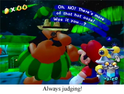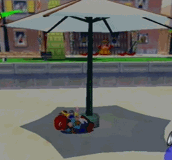 Everybody dance nowSuper Mario Sunshine is the story of Mario, Princess Peach, and her entire entourage taking a well-deserved vacation at The Isle of Delfino, a vacation destination apparently appropriate for royalty and a national hero (but not Luigi. Never Luigi). As is usually the case, there’s trouble afoot: Bowser Jr. is disguised as “Shadow Mario” and mucking up this normally sunny island paradise. Mario gains sentient water gun FLUDD and vows to run all over the island and clean up the mess.