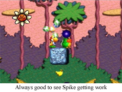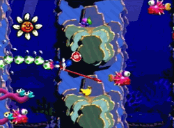 Let’s be clear here: Yoshi’s Story is a collectathon in the vein of its immediate prequel and Donkey Kong Country. Yoshi’s goal in every level is to collect thirty melons amidst the obstacle course that is every stage. This is not dissimilar from collecting every last red coin in Yoshi’s previous adventure, but with one terrible difference: every metaphorical yellow coin “counts”. Yes, Yoshi’s top goal is to collect thirty melons, but Yoshi will complete the level after collecting thirty of any fruit, whether it be melon, grape, banana, or pepper (which, if you’re unaware, is a fruit, due to the way its seeds work. Related, eggplants are berries for some reason). So Yoshi’s goal is to collect only the best fruit for only the best score, and screw your natural video game honed reflexes to collect every single fruit. This sounds like a neat concept in theory, but in practice, everyone’s first impulse is to grab everything they see, which will lead to a level being completed in, roughly, two minutes. Keep this up through the six available worlds, and Yoshi’s Story can be completed, easily, in less than an hour.