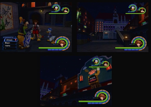 Though effectively a corridor early in the game, you can see some interesting things to start. The first picture here at the fountain is showing where Sora is looking “from”, and the other two are displaying what Sora can see from that vista. Oh, look, a happy hat maker’s shop, and some sort of grand cathedral looking thing off at the end of the street. But these landmarks are just there to spruce up the corridor, right?