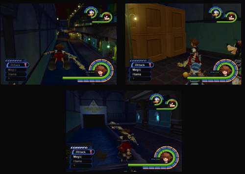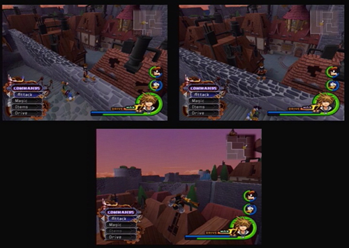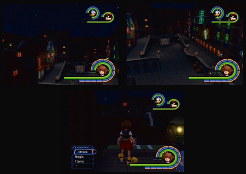 Here’s a view of the area from as high as possible. Note that Kingdom Hearts 2 now grants us a minimap in the top right corner, so we can more easily see how damn boring this has become. There’s a high road and a low road. If you try to fly out over the roofs that can be seen in the distance, you hit an invisible wall, and drop like a rock. That third picture basically tells you everything you need to know: At first glance, it appears Sora is flying out to unknown environs, anxious to explore the rest of the town, but the minimap says, “Nope, this is the edge of the corner, knock it off.”