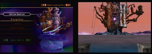 Here’s where you first arrive in Hollow Bastion Castle. That first picture shows a door that is directly beneath the bottom tip of the heartless emblem. The second picture shows a rampart far to the right that is inaccessible even via flight. And the third image shows a door and ramp that are inaccessible with even the best jumping.