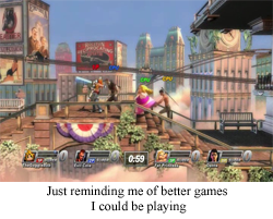 unleashes an attack that somehow affects everyone, like Big Daddy’s level three special attack, which floods the whole battlefield, leaving everyone but the guy in the diving suit drowning and ripe for death. Special attacks are, traditionally, the only way to score points in this game, so a one on one match either becomes very one-sided, very fast (the more experienced fighter building and using his special gauge repeatedly while his opponent flails and falls faster into life-debt), or it becomes a stupidly even race to see who can score a point the fastest (Player One gets a full special stock, uses it, and gains a point, Player Two respawns at 95% special stock, fills it up to 100%, gains the point, and now you’re both at 0% special stock with a tied score, repeat for three minutes, hope you score the final point at the buzzer). So, without fail, the absolute first match in one player mode is unnecessarily boring.