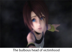I’ll tell you what happens to her, she becomes the most literal object in the history of objectifying women. Kairi is split in two, and one half is her body, which is alive and breathing, but is otherwise as animated as a tube sock. This half of Kairi is literally fought over by Sora and Riku, both of whom want to “have” coma-Kairi, and it ain’t because they desire scintillating conversation. The other half of Kairi is her heart, effectively her soul, which squirrels away in Sora’s heart. Sora spends the majority of Kingdom Hearts 1 not even noticing Kairi, his second best friend, is right there with him the entire time. So, basically, Kairi spends the majority of Kingdom Hearts 1 either as a completely silent tag along or an item to be fought over. Check your key items list for Kairi.