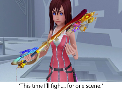 Finally, Kairi is reassembled, and her healing hug brings Sora back from the brink of darkness, and then Kairi… stands around and worries. Kairi turns out to be a Princess of Heart, they all open the keyhole to the final boss, and then proceed to stand around making statements like, “Come back safely!” or “Let’s bake some cookies for the boys,” or whatever. Kairi does nothing, despite the fact that she has the same “training” Sora and Riku had at the start of the game, so there’s really no reason she couldn’t grab a more active role and start slinging blizzard spells to guarantee Sora comes home safely.