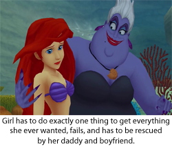 Ariel, the Little Mermaid, is the lone woman in the game that actually joins your party, and, while she’s at least not completely useless in combat, she doesn’t provide anything tangible in the plot. While, say, Tarzan joins the group and successfully saves his gorilla pals from colonialism, Ariel joins up, is tricked by Ursula, and hands the sea witch the most powerful artifact in their world. Ursula is defeated with Sora’s help, and the world is saved… from the mistake Ariel made. Kind of zero sum, there. In Kingdom Hearts 2, Ariel does the exact same thing, but with a fine set of legs.
