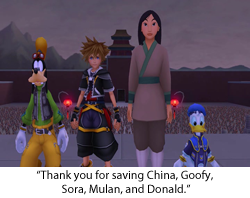 Kingdom Hearts 2 also allows one female party member: Mulan. Thanks to first seeing the movie when I was a pissy, “wake up, sheeple!” teenager, Mulan will always hold a place in my heart as being one of the first movies I completely tore to shreds from a critical perspective. I actually like the movie as an adult, but I am standing by my teenage assessment that the movie treats “female” as a disability that, through hard work and perseverance, can be overcome. Yes, in the end, Mulan proves that she’s just as much of a soldier as all of the boys, but the other 90% of the movie features her having to compensate for a lack of strength compared to the rest, is washed out despite having a mythical creature aiding her plan, and then the “soldiers in drag” bit at the finale showcases not the benefits of being a woman, but the inherit misogyny in their society. Always thought that film kind of muddies the waters of “women can do anything” to “wow, it sucks to be a woman, but you can probably pull it off with some effort”. Come to think of it, I suppose that is the more realistic moral.