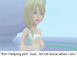 Oh, but Chain of Memories also introduces Naminé, who is the nobody of Kairi. Naminé has the ultra-specific ability to manipulate Sora’s memories, and this may seem like a really useless ability at first blush, but considering the universe turns on Sora’s every move, this actually could be important. So what does Naminé do? Well, she’s forced into the service of Marluxia, who wants a Sora that is a slave to Naminé, so, by right of double slavery, that would make Sora into Marluxia’s slave. Naminé does wipe out most of Sora’s memory before being rescued by stupid Axel, at which point Naminé volunteers to spend a year of her life gluing Sora’s brainmeats back together. Naminé’s entire contribution to the plot can be done without getting out of her chair, and is another KH lady just fixing the problem she caused in the first place.