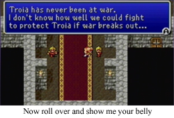 The final crystal rests with Troia. Sorta. As Troian Soldiers will tell complete strangers with no provocation, Troia has never participated in a war of any kind, and has no defenses beyond thick walls, surrounding forests, and a bunch of guards in skimpy outfits. Its complete lack of a defense winds up being its greatest asset, as Baron never even sets foot on Troian soil, because a Dark Elf (the only one on the planet?) has already stolen the Earth Crystal, leaving Troians standing around scratching their collective heads. Cecil and company steal the Earth Crystal back to trade with Baron for some item they lost, and the ruling body of Troia barely has to get up. Afterwards, the good people of Troia go back to cowering in the corner, or whatever it is they do for fun. Did I mention that this is the only matriarchy on the planet? Figured I’d throw that out there.