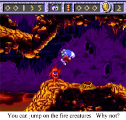 The chaseIzzy’s Quest for the Olympic Rings, as previously mentioned, was a mascot platformer, which was basically the baseline videogame of the time. Izzy himself went through a number of physical permutations throughout his lifespan, but it’s likely no accident that, by the time he decided to hit the 16-Bit world, he was a svelte, athletic blue creature with prominent red sneakers. Izzy graduated from the Bubsy school of platforming: he was destined to parade around poorly designed, repetitive worlds with his only reliable offensive maneuver limited to hopping on the same three or four hastily designed creatures. The Olympics is Greek, right? Here’s a medusa! You don’t get more Greek than Medusa, right? And how about a fire guy? Fire is an Olympic thing, too! Oh yes, before I forget, the plot of the game is that “The Ring Guardians” (who, let’s think about this, are probably guarding the rings for a reason) have decided to stick to their title and are guarding the Olympic Rings from Izzy, who wants to return the rings to Atlanta, because otherwise there would be no Olympics, and Ted Turner would be most cross. So off Izzy goes, jumping and climbing and losing an entire dimension in an effort to prove himself useful to his Olympic handlers.