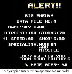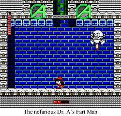 There there’s the bosses. The Robot Masters… no… that’s not right… hm… they all have number designations, right? These “Mighty Numbers” come from Alternate Caption: Fat Man takes flightthe poor side of boss design, where it’s completely standard to zoom around the screen in some invincible but generally boring pattern, and then putter about waiting to be hit before launching back into that same pattern. Repeat for far too long. My kingdom to never again have to kill time dodging continually while waiting for the one time I can use the fire button. For a more modern example, please see Hyrule Warriors. Strangely, the final bosses seem to abandon this model for some more pleasing continual, active dodge ‘n fire, but it comes far too late in a game that isn’t even really that long. Good luck getting past Mighty Number One and his ability to turn into a living laser!