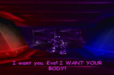 And here’s the good ol’ double entendre. See, the evil brain in a jar wants Evo’s body to live in, not for anything lewd. But you could interpret it either way! Haha! Funny joke, everybody laughs.