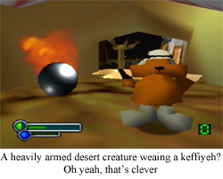If you’re a frequent reader of my musings, you’d probably expect that down in the random bullet points section, I would, not for the first time, lament the fact that this is a N64 game, and thus butt-ugly and about as appropriate for modern gaming as Atari Pitfall. “There’s good gameplay here,” I’d grieve, “And a fun story with interesting locales, but it’s terribly dated, and about one controller pak away from being completely unbearable.” Then I’d probably make a bear-pun, maybe something involving “kuma shock!”, and beg for a remake: a version of this game that looks like it at least was rendered with more than six polygons, and maybe support for a controller that was intended for more than one game. Please, someone bring Space Station Silicon Valley into the modern era, so a whole new generation can experience the joy of polar bear tanks!