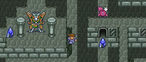 Final Fantasy Mystic Quest has monsters you can see, but you won’t ever see them respawn. Okay, yes, they’ll return if you leave an area and then double back, but there is literally never a reason to do this at any point in the game. That means that you can defeat every single monster in any given dungeon, and then explore to your heart’s content without fear of reprisal. There’s a reason I still have a poor mental picture of the shape of Final Fantasy’s Marsh Cave while I could show you almost the entirety of FFMQ’s Mine right now. Actually, yeah, here you go: