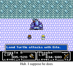 Final Fantasy Mystic Quest takes the guess work out of monster slaying. Bombs are effective against beholders, and you’ll be reminded of that every time you blast one of those giant eyeballs and a message relays, “Beholder is weak against bomb attack.” It might get old seeing that message every time, but it’s great for people for whom JRPGS do not come naturally. Hell, I bet you could found an entire empire of JRPGs for children on the simple concept of continually noting “Super Effective” attacks.
