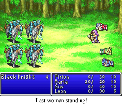 Final Fantasy 2 is a terrible, awful game, and I will tolerate no disagreement on this point; however, it is the first JRPG I know of where there’s a clearly defined female PC that is also 100% just as capable as the male party members. She starts with a bow and stats with an emphasis on magic, but if you want to make Maria into the team heavy, go ahead, she’ll be just as adept as that Guy guy. This is a trend that continues through a number of Final Fantasy games, and makes the idea of “girl power” teams much more viable than in games where your female party members are exclusively good at healing. So, good start, guys!
