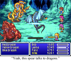 Final Fantasy 5 is a return to form. Lenna is a princess, but I think is officially queen by the end of the first world. Kind of an important distinction there, as she’s fighting for her father initially, and then her kingdom and the entire world as the plot progresses, portraying a nice bit of maturation on her side. Faris is better than male or female, she’s simply a pirate with her own personal sea serpent, which I believe qualifies her for some kind of Best Character Olympics. I suppose I could take time out of my busy day of writing about Final Fantasy