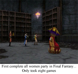 Which, really, sums it all up. The Women of Final Fantasy are by no means perfect, either from a character or individual perspective, but, overwhelmingly, they work out okay in the end. They’re varied (though there are an overwhelming number of princesses), they’re smart, they’re strong, they’re everything a woman can be (except over 25). From Maria to Serah, the Final Fantasy franchise has created a number of laudable women, and hopefully will continue… in Final Fantasy 16. Come on, guys, Final Fantasy Sweet Sixteen! It writes itself!