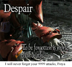 Freya is pretty much a male archetype in a rat lady’s body. She’s a noble knight, forsaking her kingdom for the sake of her lost love, questing and righting wrongs while hoping to one day find the bride… err… groom she once lost. She’s also the most useful, competent damage dealer in the party, and has a distinctly friendly relationship with Zidane.