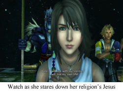 Rikku shows a similar determination, just in a different direction. Rikku IS going to save her cousin, and she’s not concerned with how the entire rest of the planet feels about it. Much like Lulu, Rikku will do anything for Yuna, but in this case, she’s leaving the planet behind, damn the whole better world thing, she just wants to see someone she cares about live her life. It’s no mistake that she seems to get along well with Tidus: they’re on the same page even before they can understand each other. It very much makes for an interesting dynamic, as Rikku and Tidus almost come off as selfish or childish in wishing for a future where the world is saved with Yuna alive, but, in the end, they’re both proven to be completely correct, and not by accident, but through their own actions. Team Yuna stands up to Sin for Spira, Rikku stands up to Spira for herself… and wins.