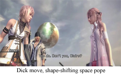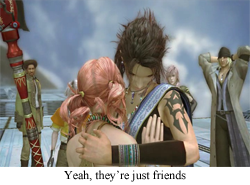 But Vanille is no Kain. Yes, she lied to the party, but why? She lied because she was a prosecuted minority in society (l’Cie) and had, accidently, hurt another member of the party (Sazh and his son). She wasn’t lying because she needed to maintain her secret plan to steal the crystarium at the last moment or some such nonsense, she lied to keep her new friends. She lied because she didn’t want to hurt anyone or be hurt. She lied, in short, because she was human. This is why, despite all the crap heaped on Vanille, I can’t be anything but happy with this very human character, who is flawed in a completely normal way in a completely fantastic circumstance. I can say with almost complete confidence that I will never have to contemplate using a WMD on a rival kingdom, or sacrificing my life to bring a temporary peace to the world, or even what it means to feel love when I’m half fluorescent pink monster; but, on a nigh daily basis, I have to make decisions about whether I’m going to be honest and truthful, even when it hurts someone I care about, or makes them think less of me. And, yeah, Vanille makes the wrong decision in a lot of cases, and she has to deal with the consequences, and that takes a kind of strength you don’t usually see in a series where leveling up is the only way to get past obstacles. Sometimes in the middle of even the greatest fantasy, you need to know there are real humans out there.