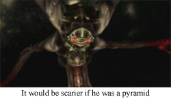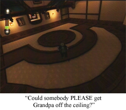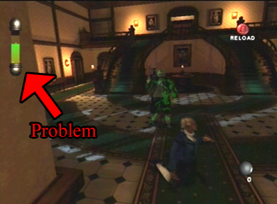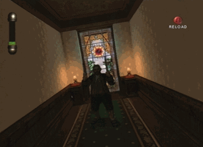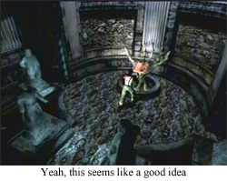 And then there’s the other elephant in the room: when you have every capability to control the presence of the elephant, you’re not really dealing with an elephant, you’re dealing with, I don’t know, a pug. Nobody is afraid of pugs. I spent the weekend dealing with a pug, and, should that pug have snapped into vicious mode, I could have just tossed that pug in a manner not unlike a football, and been done with the problem (NOTE: No animals were harmed during my time pug-sitting. He’s a good boy. Good boy). The sanity meter© 2002 Nintendo works in much the same way: you have almost full control over that meter, so you don’t have to deal with any insanity effects if you don’t want to. On the rare occasions when you have lost control, though, you absolutely know it, because that omnipresent gauge is chilling right there in your field of vision, and if it’s dipping low, brace yourself for horror.