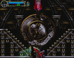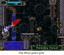 C:SotN was a landmark Castlevania game in a lot of ways, and its clock tower magnifies this fact. In nearly all previous Castlevania games, the clock tower was a grueling platforming challenge, with grinding gears and swooping medusa heads constantly encouraging the Belmont du jour to reach terminal velocity on his way to some uncomfortably placed spikes. In the SotN clock tower, all of those elements are present, but they have been defanged by the new “explore ‘em up” nature of the game. No longer do you have to fear an unforgiving death plummet into the unknown, no, now you have the full height of the screen to explore, and Alucard doesn’t dread a fall from a tower any more than diving off a waterfall or jump-kicking out of his dad’s throne room. In making Symphony of the Night a more interesting game, a less challenging, but more fun, clock tower was created.