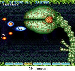 old man handing out swords was doable after a few a stops and starts. But Gradius? And similar games, like Abadox or Life Force? Forget it. I distinctly remember renting Abadox as a child, and never making it past the second level even after playing it continuously for three days. I, just now, pulled up a video of Gradius and… let’s see here… yes, I don’t think I ever consistently made it past the third, Moai based level. And I know I never beat that game, as I never forget a giant brain. I owned Gradius as a child, which makes it one of those rarified NES games I played constantly (because I’m pretty sure there were something like 68 hours in a day when I was a child), but I barely ever made it past level three.