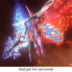 Most JRPGs end with a battle against “god”, but, more often than not, you’re dealing with a false prophet. Final Fantasy 6’s Kefka was the “god” of his world, but he’d only had that power for a year or so, and it wasn’t like he all-fathered Terra or Phunbaba. Sephiroth might have been held aloft by angel wings, but they were simply heisted from lifestream seagulls or something. In fact, the closest Final Fantasy proper ever gets to slaying a god is the army of “caretaker” gods that show up later in the series: Yu-Yevon is an ascended man who decided to get some statuary to his name, The Undying is simply a god/man hybrid that gets great gas mileage, and Final Fantasy 13’s Space Pope is just another in a long series of “gods” that think they know best for everybody but are merely suicidally depressed. The Pulse Fal’Cie are divine teenagers, nothing more. Lightning finally gets to slay a capital-G God at the finale of Lightning Returns, but even that is sullied by the fact that ye God didn’t even deign to wake up for the 500 years that comprise the previous games, and “the world” is some kind of weird, off-kilter afterlife, and not anything even remotely like a more relatable “Earth” (Do people age? Y/N).